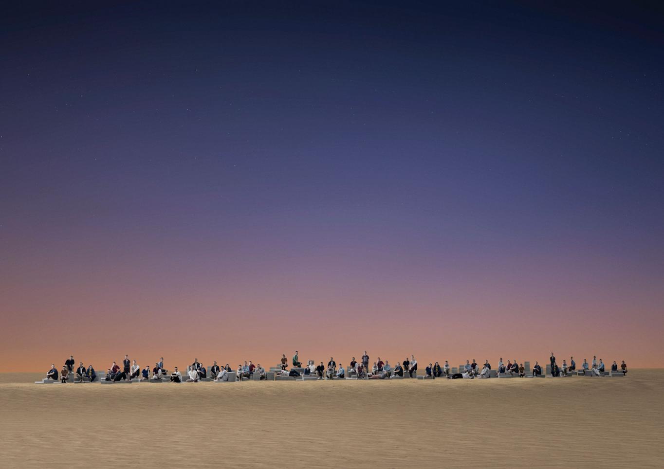 Hacohen recreates The Chorus of the Hebrew Slaves from Giuseppe Verdi’s opera Nabucco, in a two-channel video installation that invites stillness, reflection, and contemplation. Against the backdrop of a cycle of sunrise and sunset, the artist’s figure is multiplied repeatedly into a choir singing with yearning to return home.