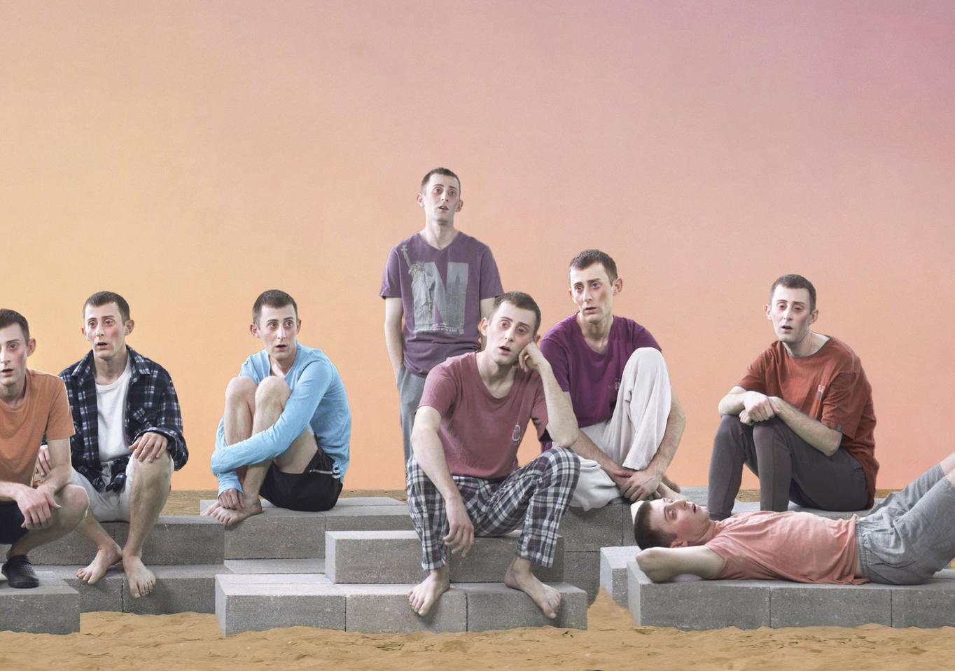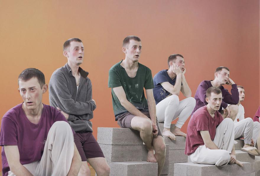 Amid the ongoing war in Israel and Gaza, Hacohen's chorus evokes the continuing displacement and loss. The figures are dressed in makeshift pajamas and printed t-shirts bearing various symbols – KKL, Bnei Zion Yeshiva, the Statue of Liberty, Adidas, and others – some barefoot, others in slippers, all appear haunted. With faces powdered to a sickly pallor, Hacohen expresses the search for an individual voice as it inevitably sinks into the collective suffering. The choir singing in unison becomes a tribune of mourning and prayer, resonating against the grim duality of this place: two cultures, two histories, two collective consciousnesses, each singing its longing – their voices mingling in sorrow and yearning for return.